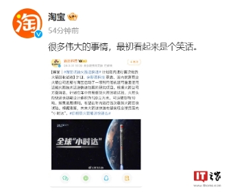 箭元科技近日宣布與淘寶開(kāi)展火箭試驗,未來(lái)有望全球范圍內“小時(shí)達”,引發(fā)網(wǎng)友熱議。面對質(zhì)疑,淘寶官方回應稱(chēng):“很多偉大的事情,最初看起來(lái)是個(gè)笑話(huà)”。