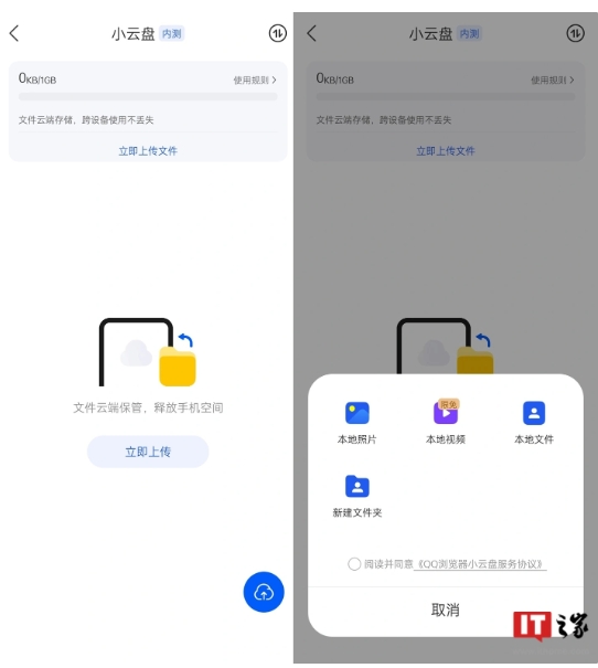 QQ 瀏覽器于 2022 年 10 月底下線(xiàn)了“云備份”及“云空間”功能,但 QQ 瀏覽器近期又開(kāi)始測試一項新的網(wǎng)盤(pán)類(lèi)功能“小云盤(pán)”。
