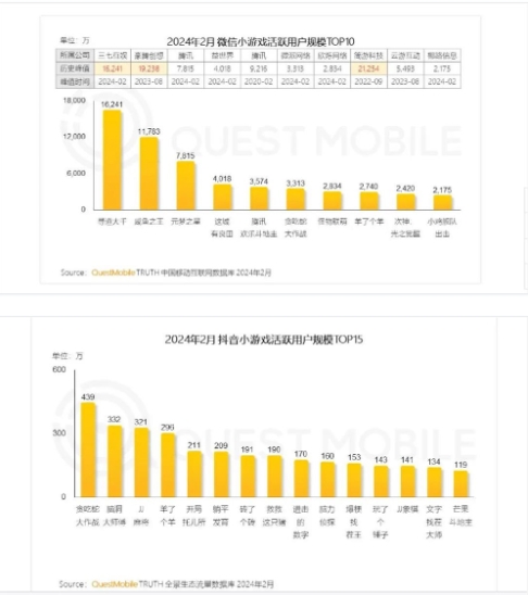 QuestMobile數據顯示,2024年2月,小游戲市場(chǎng)迅速增長(cháng),例如,微信小程序游戲活躍用戶(hù)達7.5億,在全景流量中占比達80.3%。微信曾給出相關(guān)數據,2023年微信小游戲廣告消耗增長(cháng)30%,商業(yè)規模增長(cháng)超過(guò)50%。而三七互娛旗下的尋道大千活躍用戶(hù)規模超過(guò)1.6億。