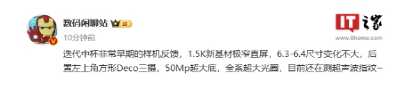 該博主透露,這款迭代中杯早期樣機配備 1.5K 新基材極窄直屏,機身尺寸為 6.3-6.4 英寸,后置左上角方形 Deco 三攝,配備 50Mp 超大底以及全系超大光圈,目前還在測超聲波指紋。